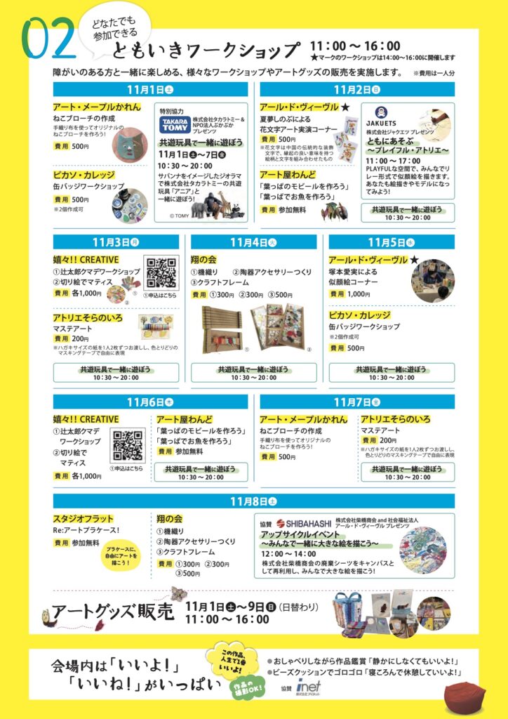 会期中は、誰もが楽しめる参加型のイベントやアートグッズ販売も日替わりで実施します。