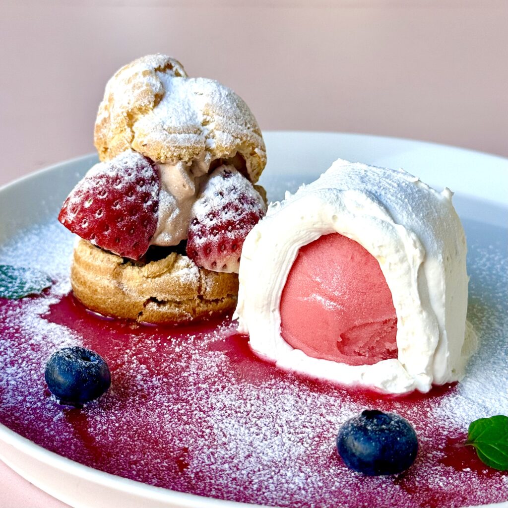 粉雪の中で寄り添ういちごを表現した、心あたたまる一皿です。