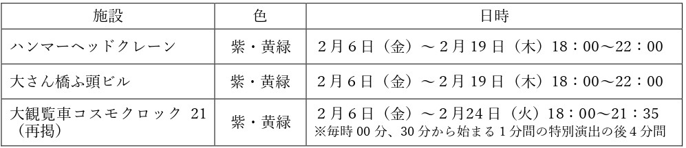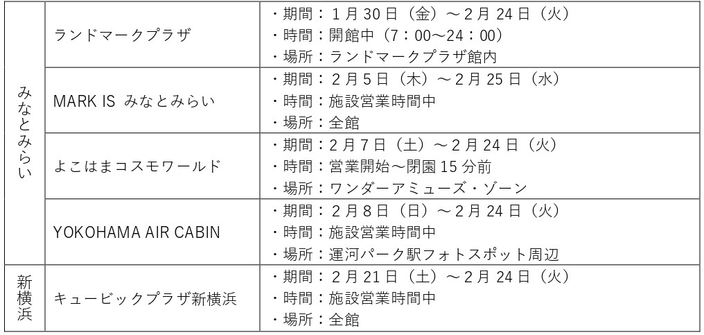◉点灯⽇時:2⽉6⽇(金)〜2⽉24⽇(火)18:00~21:31(最終点灯は21:30~)