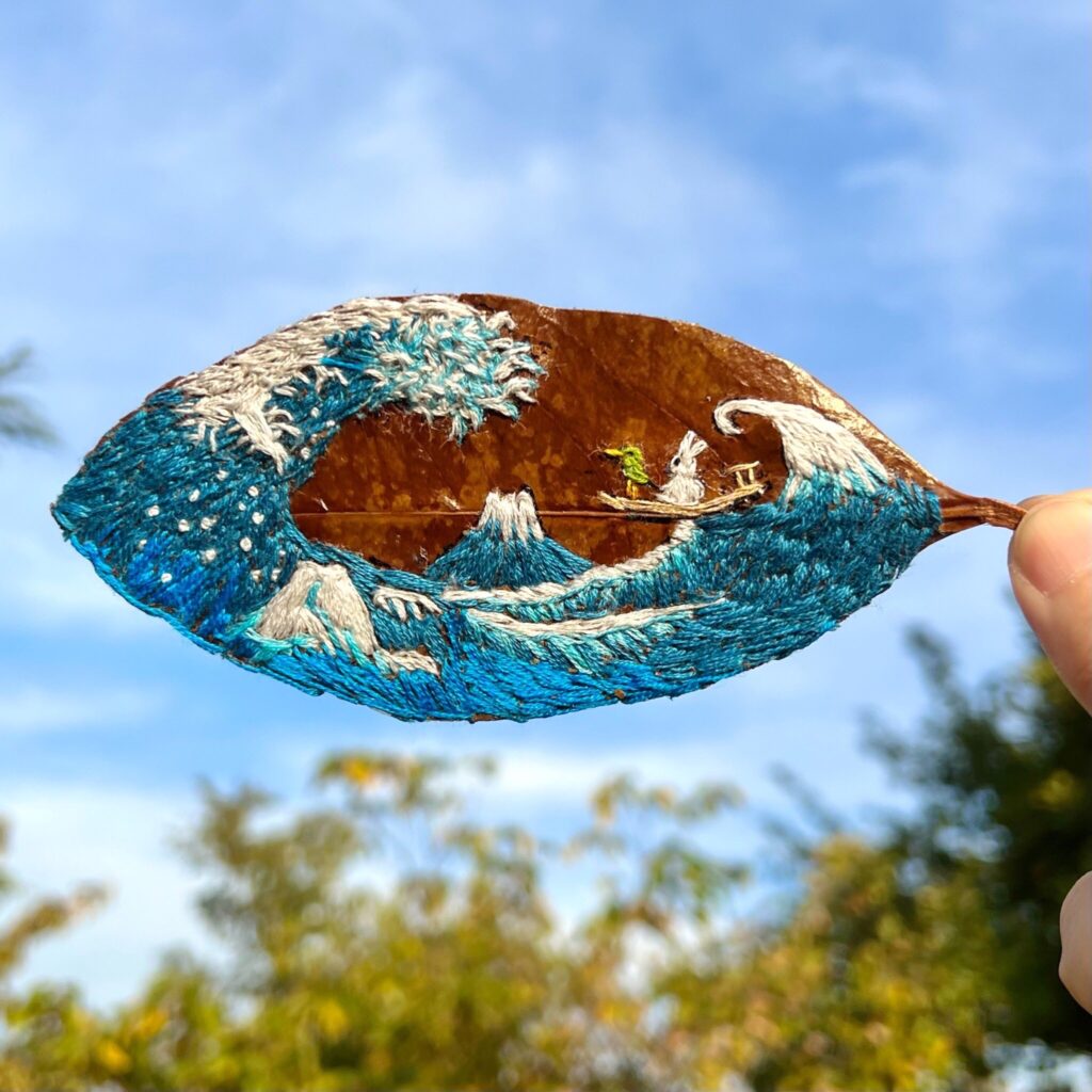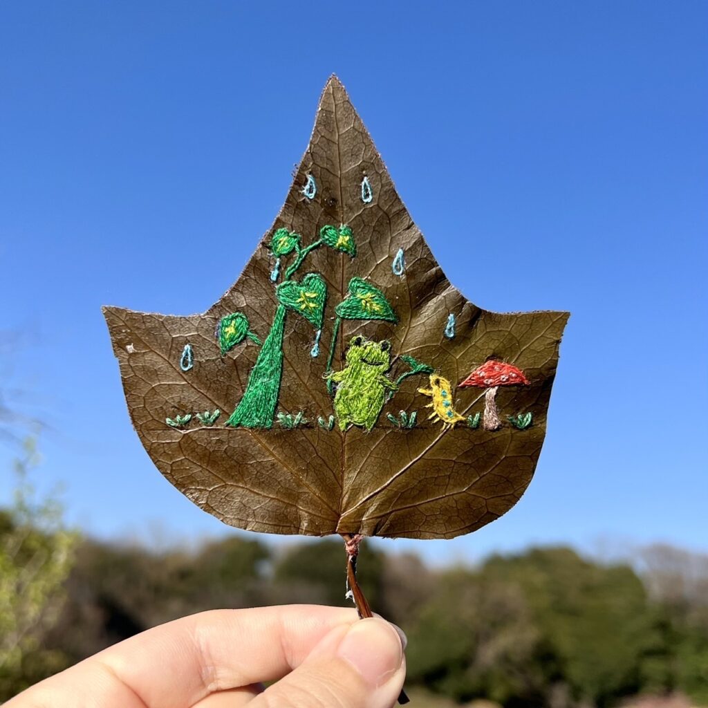 紙粘土作品や色鉛筆画などを経て、2021年6月から葉っぱ刺繍をスタート。