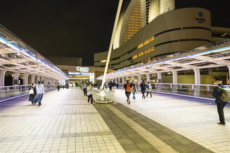 パシフィコ横浜の玄関口であるクイーンモール橋では、青の光の波がガラス屋根を彩ります。