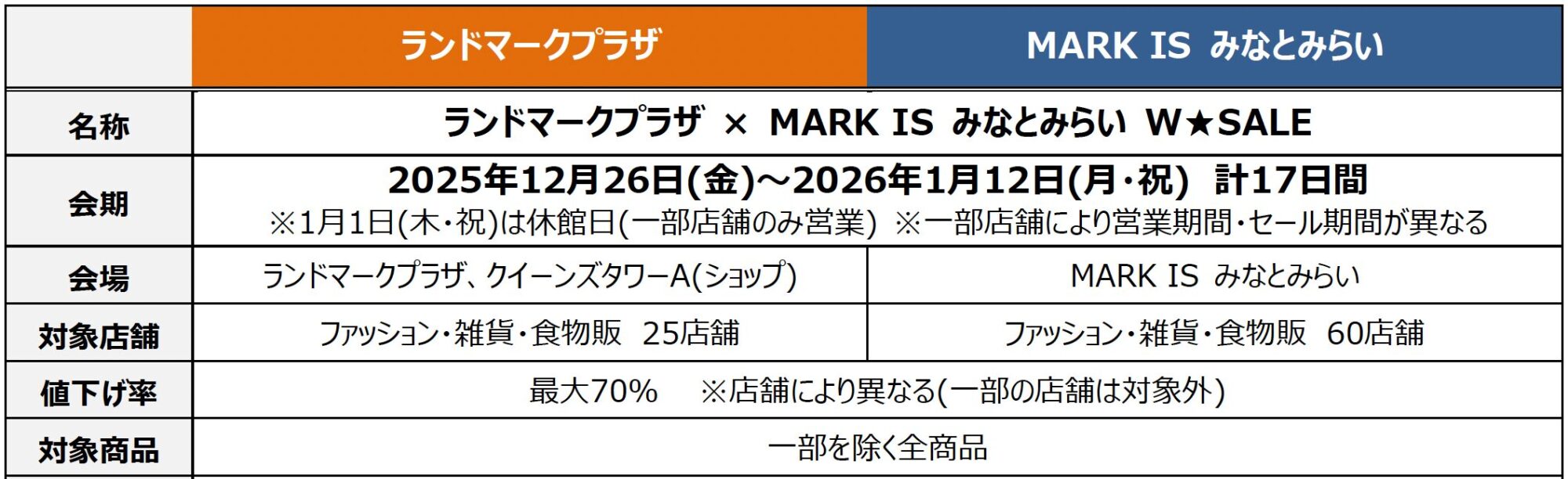 ランドマークプラザ、MARK IS みなとみらいは、合同で年末&新春セール「ランドマークプラザ × MARK IS みなとみらい W★SALE」を、2025年12月26日(金)~2026年1月12日(月・祝)の会期で開催します。