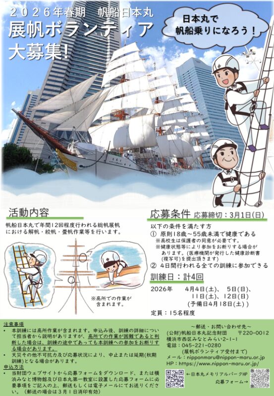 帆船日本丸では、2026年度春期の新規展帆ボランティアを下記の通り募集します。
