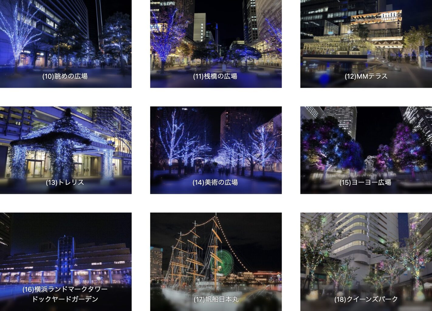 - 横浜駅東口、はまみらいウォーク、みなとみらい歩道橋、グランモール公園、帆船日本丸(船体整備期間は除く)など各エリア