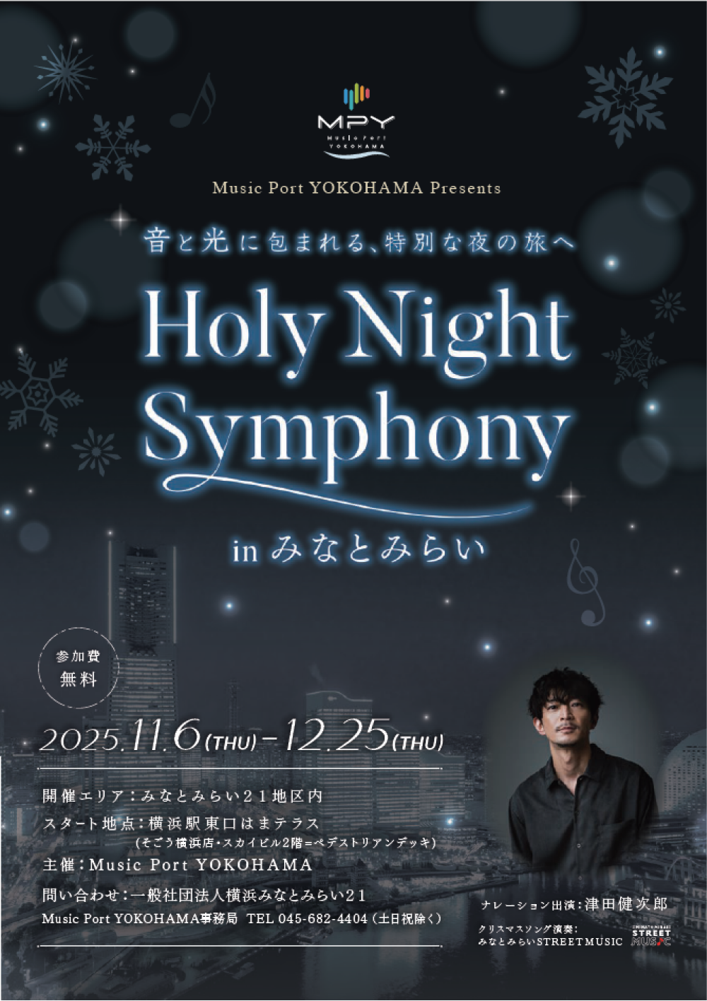 2025年11月6日(木)〜12月25日(木)のイルミネーションに包まれるクリスマスシーズンのみなとみらいを舞台に、「みなとみらいSTREET MUISIC」登録ミュージシャンによるクリスマスソングの演奏と共に、声優・俳優として活躍する津田健次郎さんのナレーションをオリジナルのストーリーに乗せてお届けします。