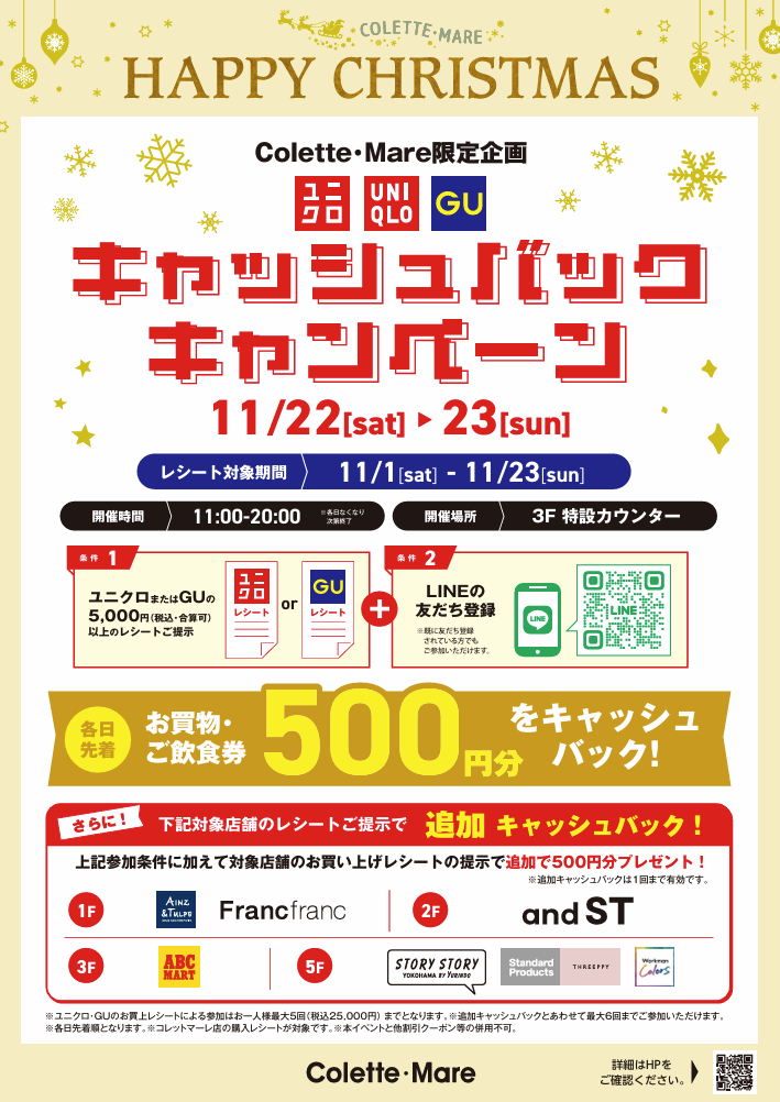 コレットマーレ限定企画!レシートを集めて参加しよう!”ユニクロ・GUキャッシュバックキャンペーン”を11/22(土)-23(日)に開催!