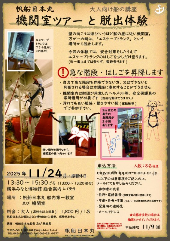 帆船日本丸では、11月24日(月・振替休日)、大人向けの船の講座「機関室ツアーと脱出体験」を開催します。