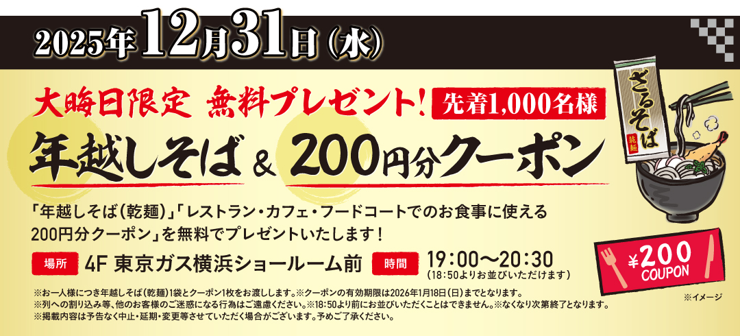 今年1年間の感謝をこめて、大晦日12月31日(水)19:00から、先着1,000名様 に「年越しそば(乾麺)」と、レストラン・カフェ・フードコートで使える200円クーポンを無料でプレゼントします。