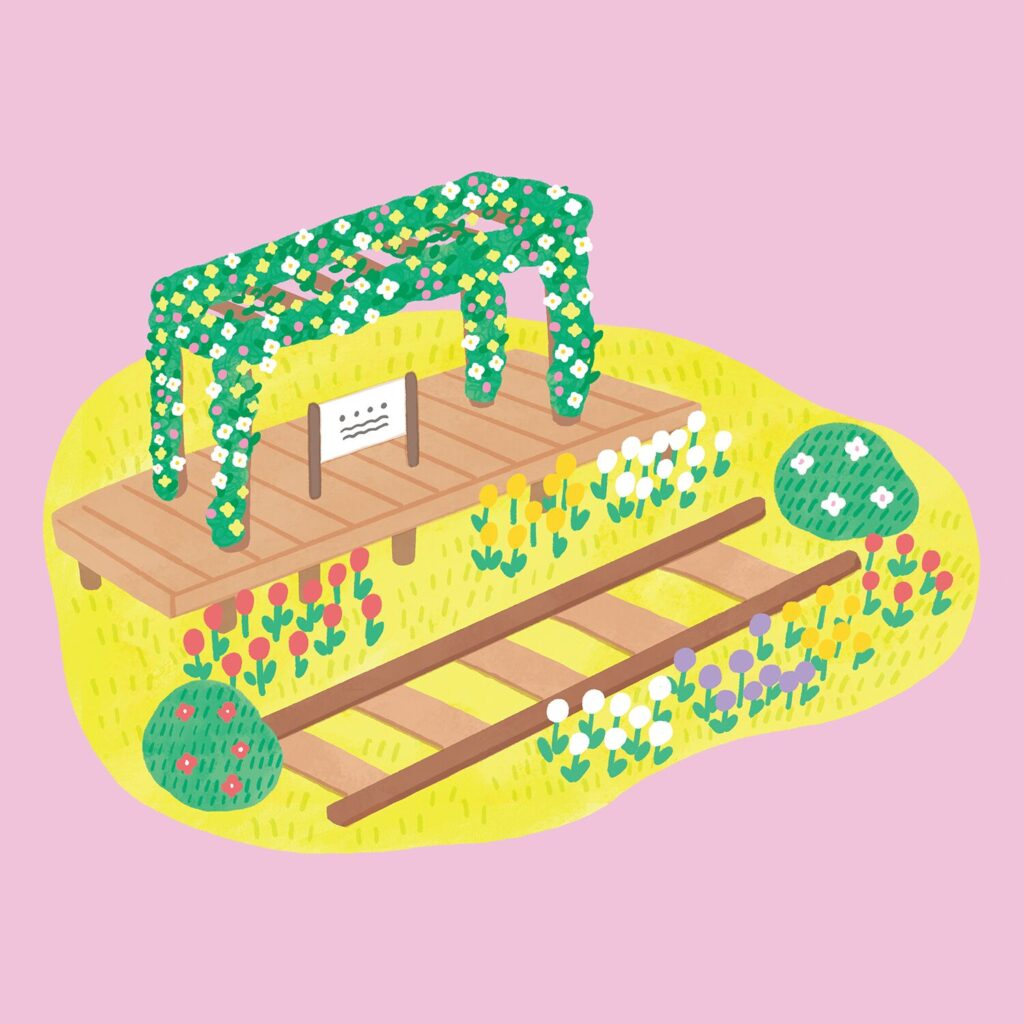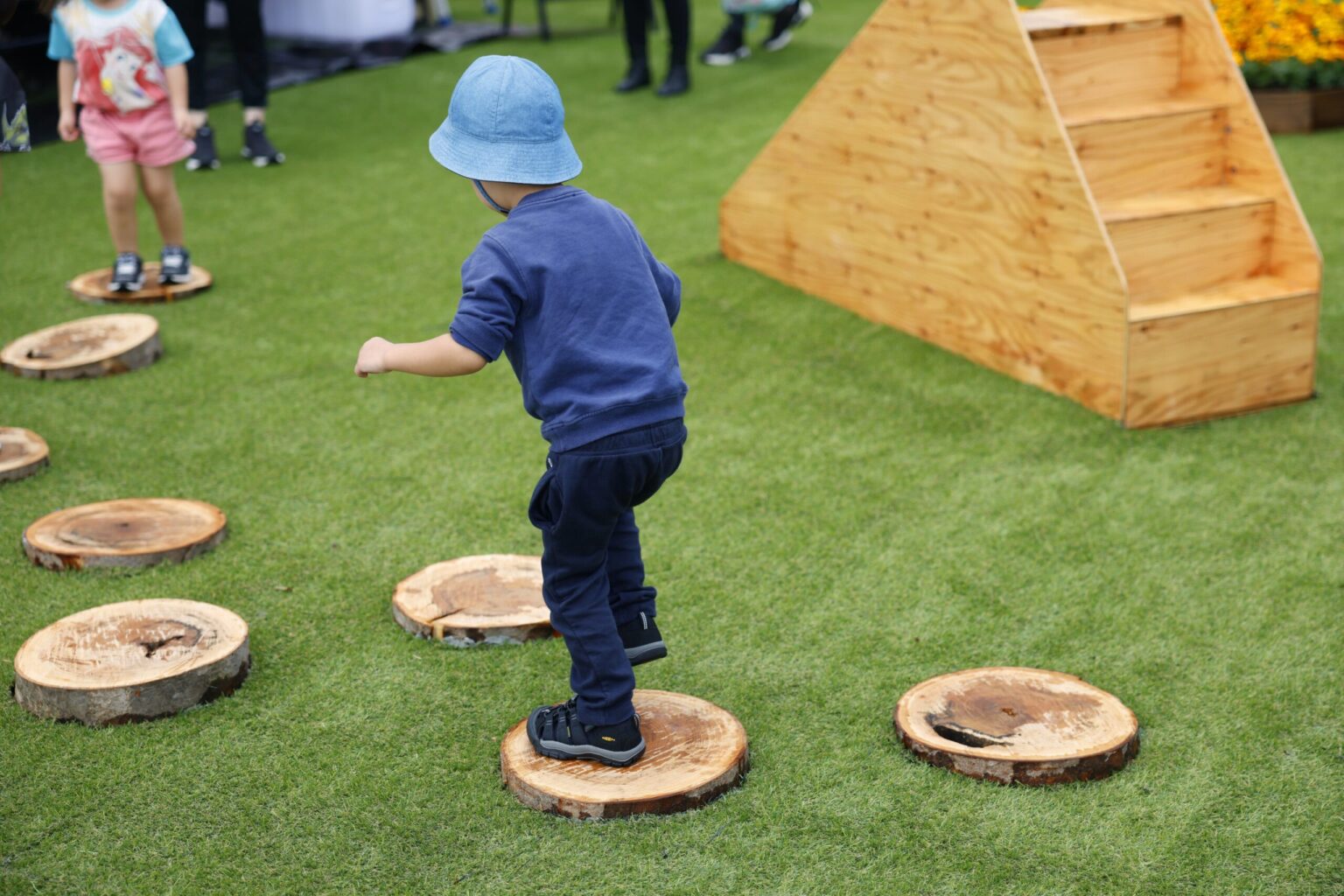昼は、陽光に輝くカラフルな花々と木製遊具のプレイエリアが広がります。