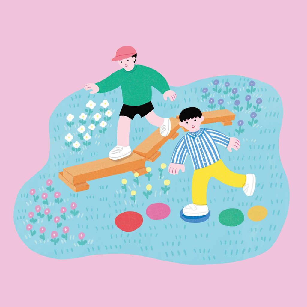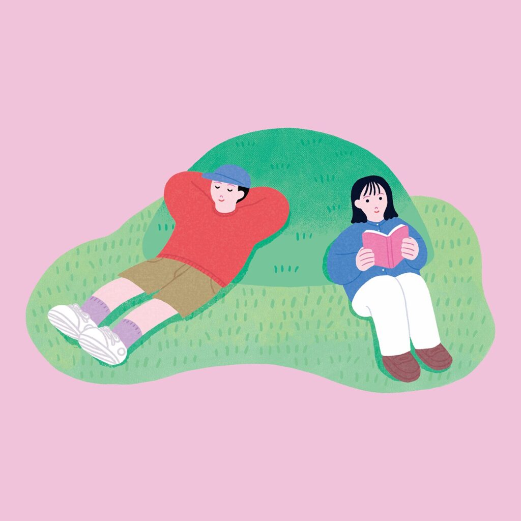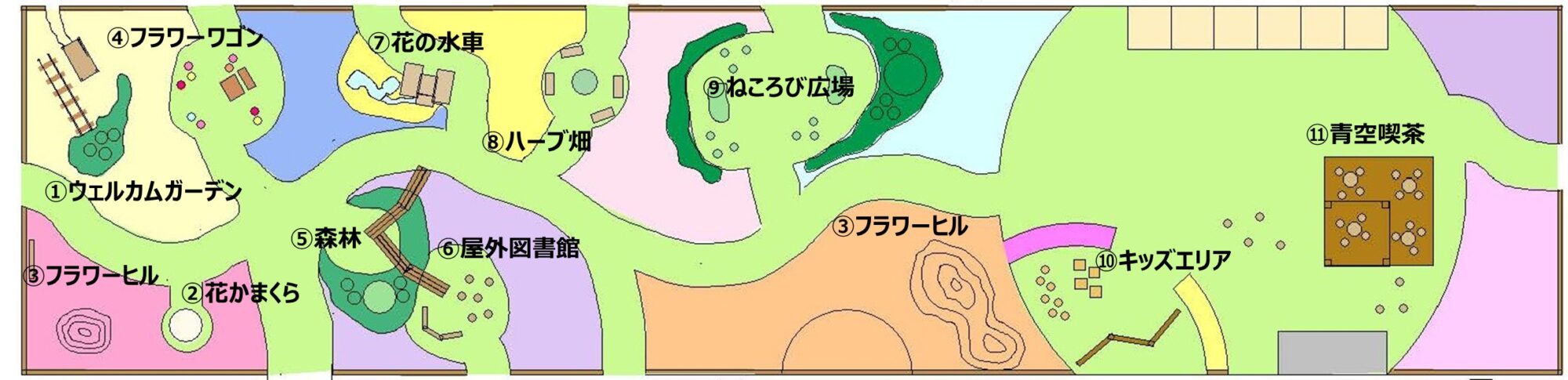 芝生ベンチや寝転べる丘も設け、リラックスできる空間を用意します。