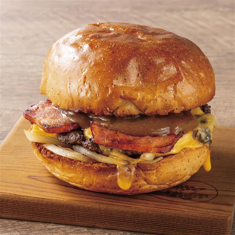 自慢の牛肉100%パティにハンバーグソースを使用した『ハマ、トラ。バーガー』。