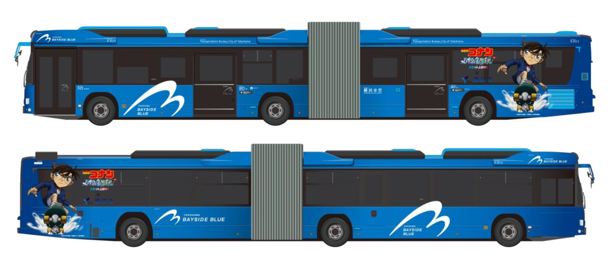 連節バス「ベイサイドブルー」では、コナンデザインのラッピングバスが運行。