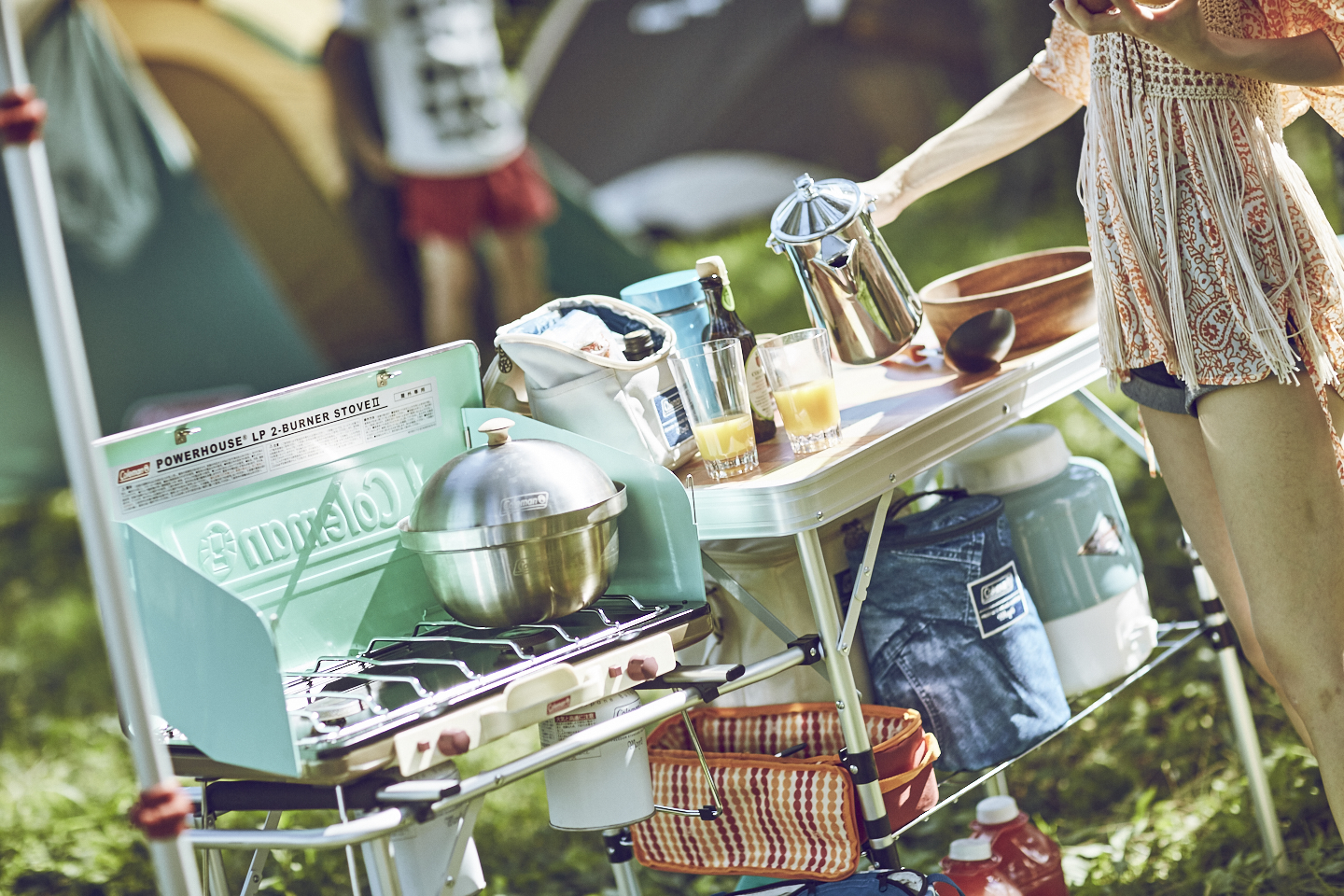キャンピングカーやアウトドアブランド「コールマン」のグッズを使った