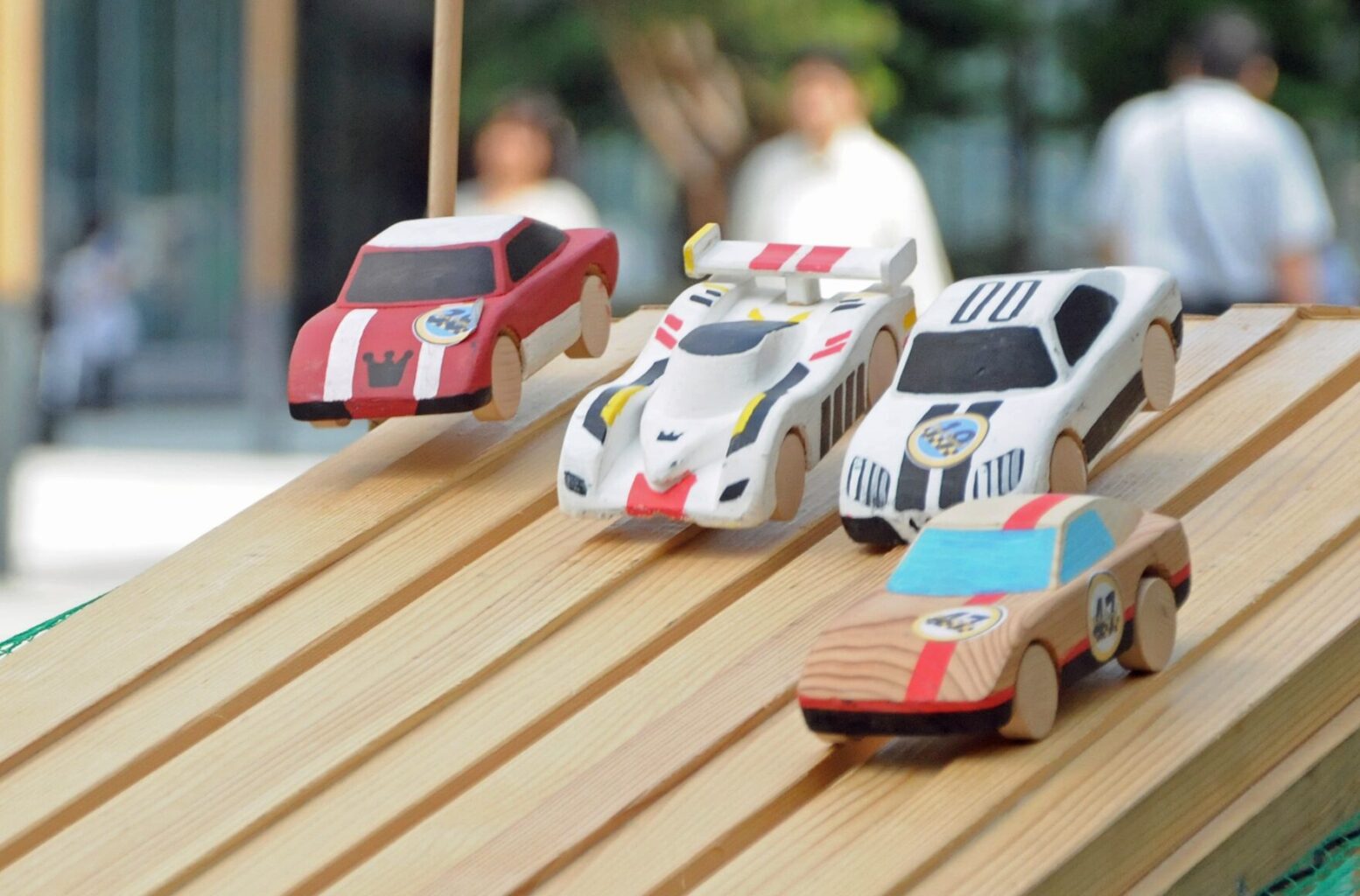 黒板消しサイズの木製ミニカーを組み立て、自由に着色。完成後は、動力を使わない10mの傾斜コースでタイムを競うレースに挑戦