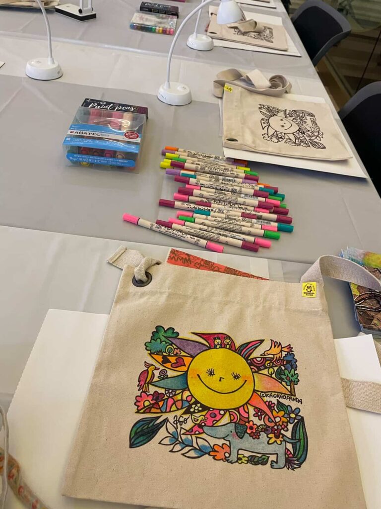 サコッシュにプリントされたかおかおパンダさんのイラストをカラフルな色で塗って仕上げます。