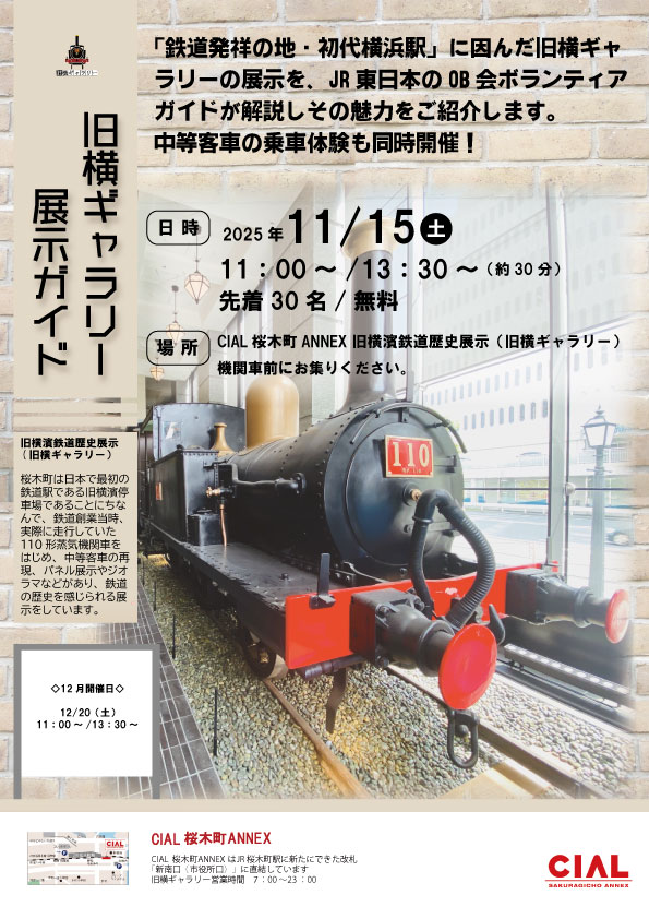 CIAL桜木町ANNEX 1F 「旧横ギャラリー」にて、11月15日(土)、「鉄道発祥の地・初代横浜駅」にちなんだ旧横ギャラリーの展示を、JR 東日本のOB 会ボランティアガイドが解説しその魅力をご紹介します!