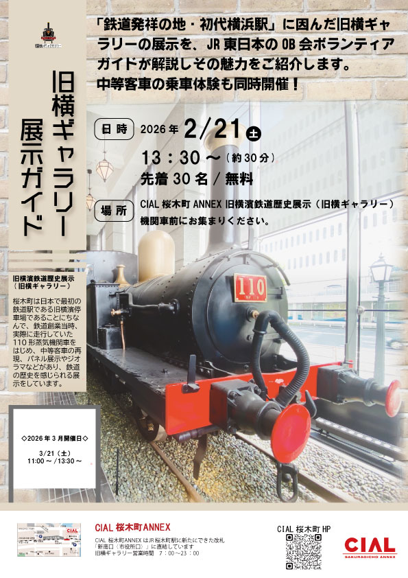 CIAL桜木町ANNEX 1F 「旧横ギャラリー」にて、2月21日(土)、「鉄道発祥の地・初代横浜駅」にちなんだ旧横ギャラリーの展示を、JR 東日本のOB 会ボランティアガイドが解説しその魅力をご紹介します!