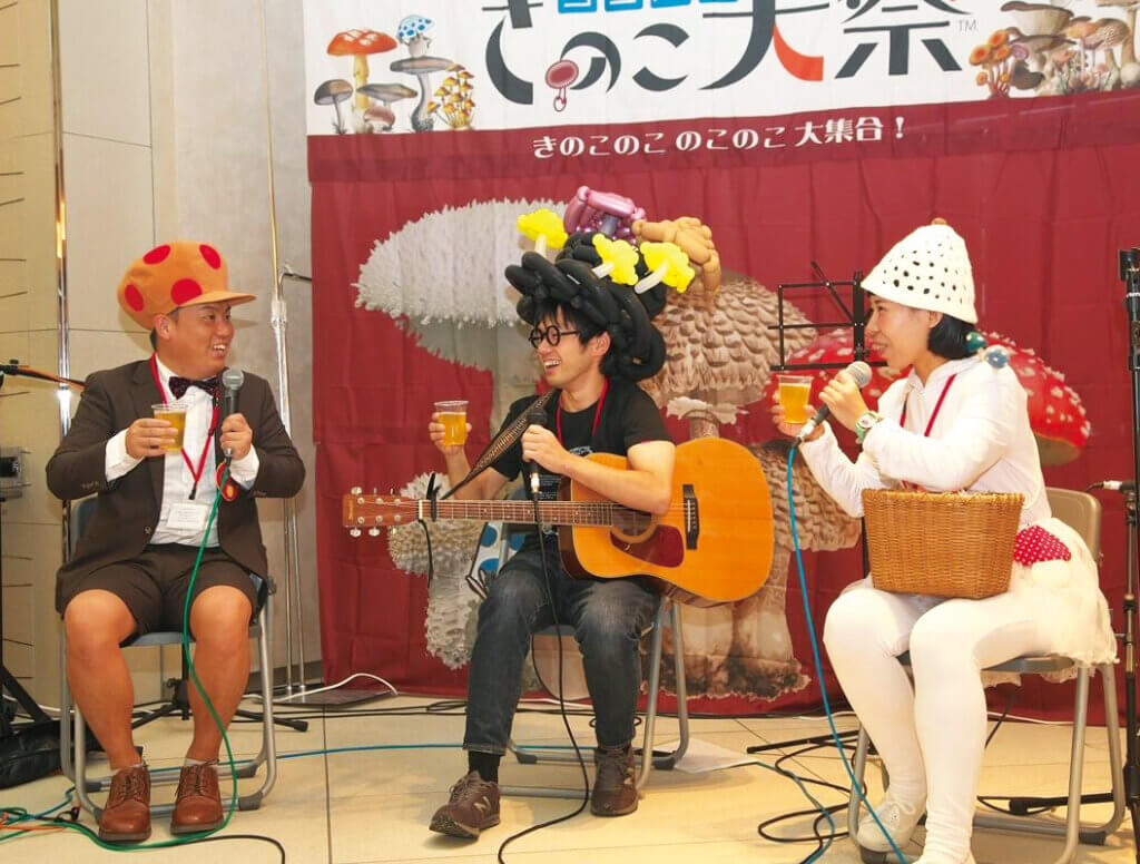 きのこをテーマとした、オリジナルソングのライブやきのこ好き芸人によるトークショーなど、楽しいステージが繰り広げられます。(写真は過去例)