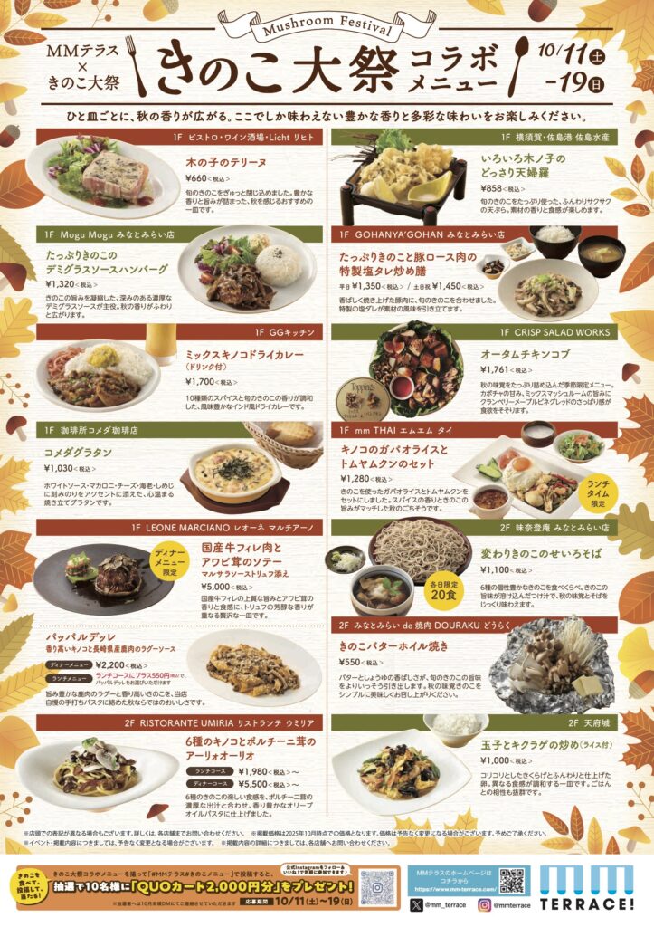 10月11日(土)〜19日(日)の9日間限定で、MMテラス各レストランにて、今しか味わえないきのこメニューをご提供。