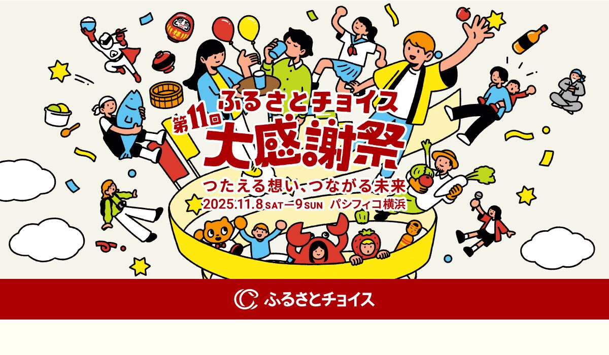 11月8日(土)、9日(日)の2日間、パシフィコ横浜にて、全国から過去最多となる163の自治体が集結し、ふるさと納税のお礼の品など地域の魅力を紹介する日本最大級のふるさと納税イベント「第11回ふるさとチョイス大感謝祭」を開催します。
