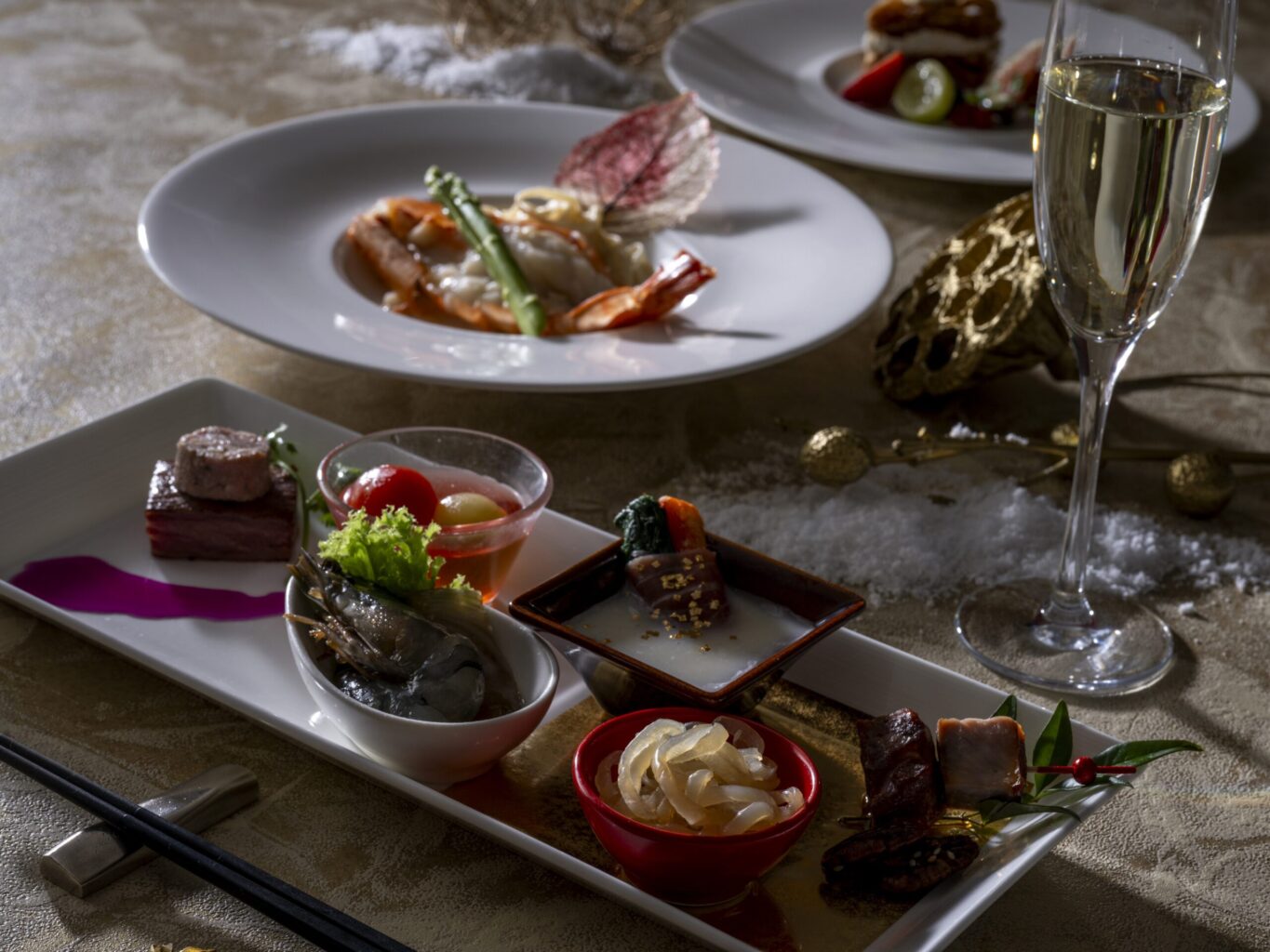 ホテル最上階31階のメインダイニング 中国料理「驊騮」では、色とりどりの前菜盛り合わせやフカヒレが丸ごと入った蒸しスープ、山形牛サーロインと高級魚ハタを組み合わせたメインディッシュなどの全6品に、グラスシャンパンとオリジナルの中国茶が付いた豪華絢爛なクリスマスディナーコースを愉しむことができます。