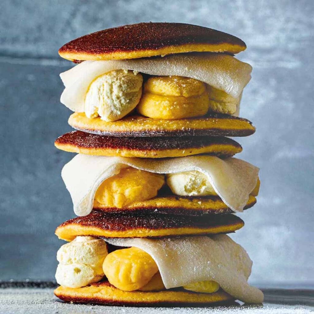 こし餡・スイートポテト・ホイップクリームに羽二重餅を重ね、ふわふわのどら皮でサンド。