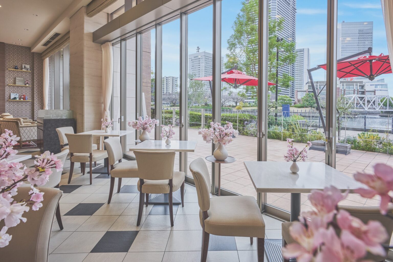 大きな窓の先にはみなとみらいの水辺が広がり、春には汽車道の桜も楽しめるロケーション。