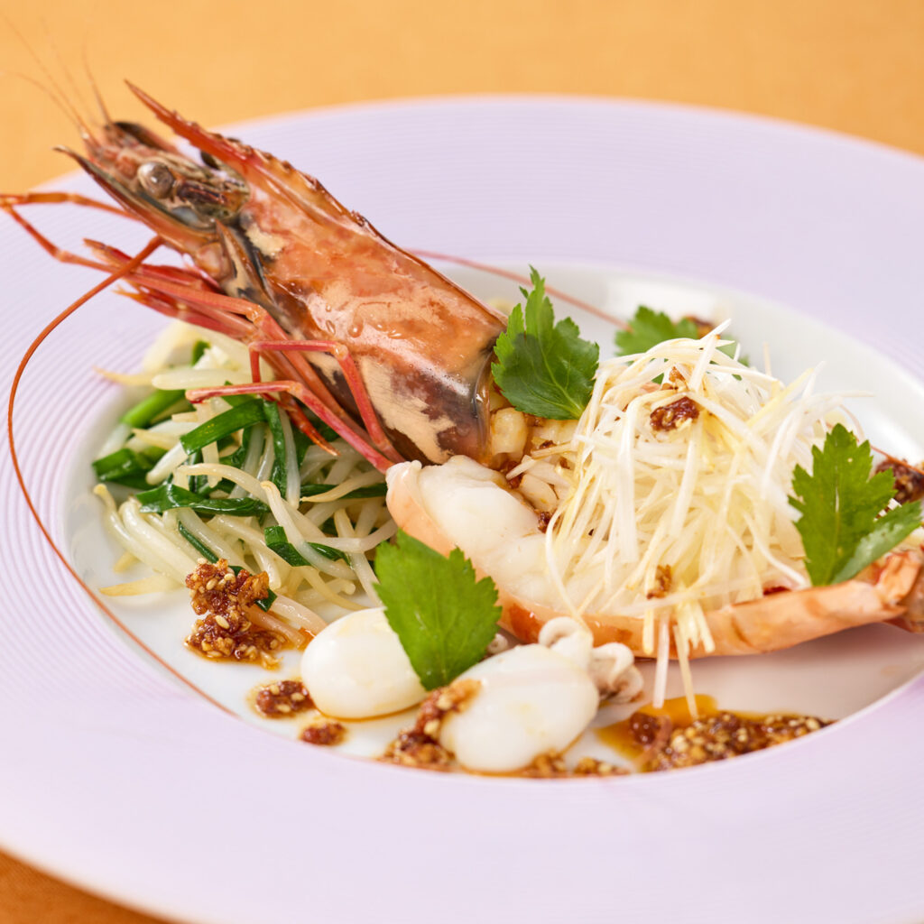 有頭海老と甲イカをふっくら蒸し上げ、香ばしい葱の風味が広がる醤油ベースの香油で仕上げた一皿です。海老の甘みが引き立つ、上品な味わいを楽しめます。