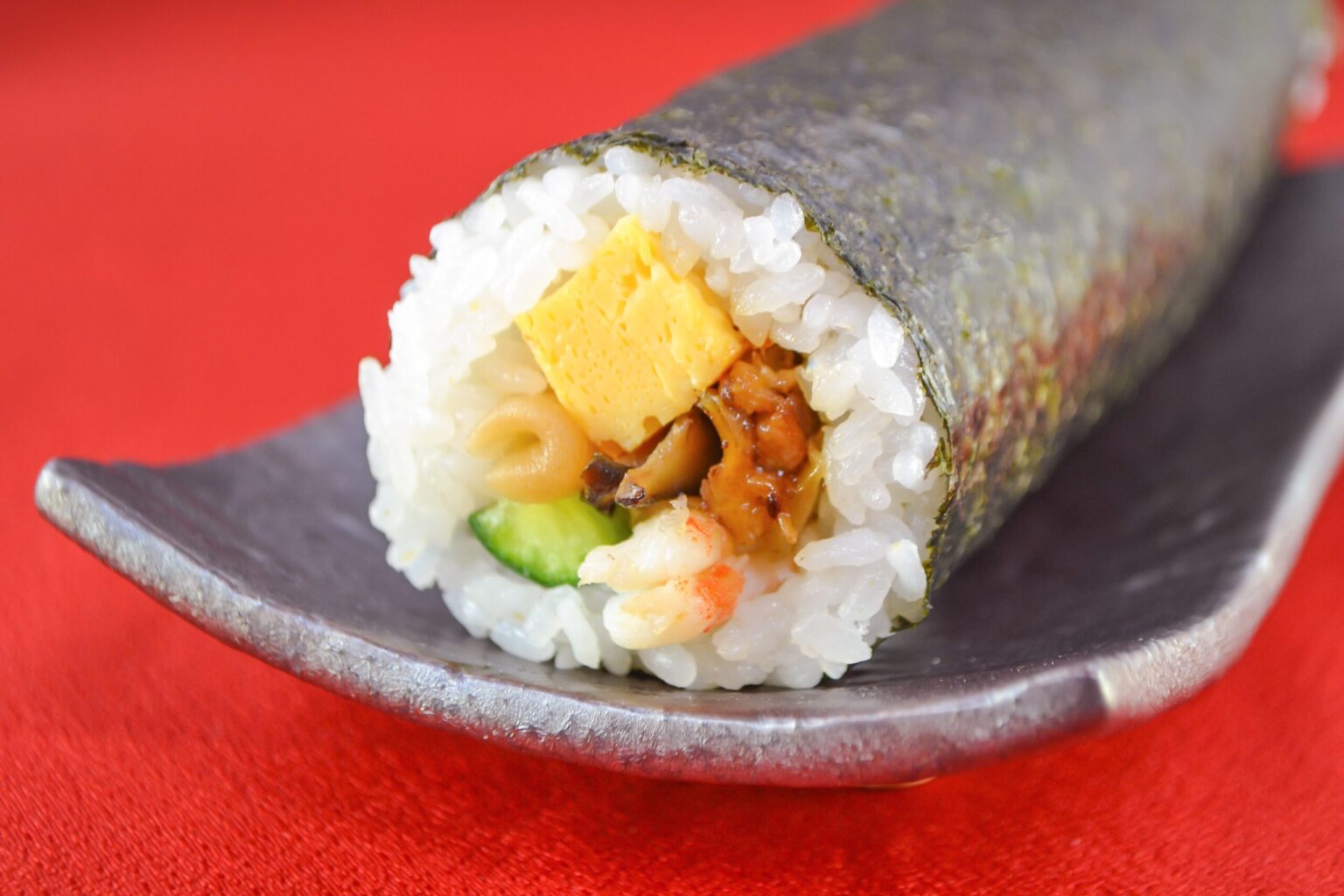 近年は、七福神にちなんだ定番の7種具材(かんぴょう・しいたけ煮・玉子焼き・うなぎ(もしくはアナゴ)・桜でんぶ・えび・きゅうり)に加え、
