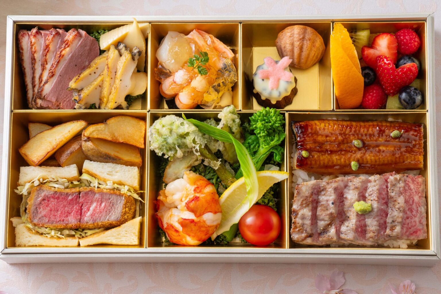 開業時から人気の前菜「贅沢サラダ」をはじめ、「黒毛和牛フィレカツサンド」や「うな重」などを詰め合わせ、前菜からデザートまで楽しめる、ボリュームも内容も、充実の内容に仕上げました。
