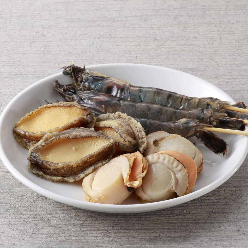 串付きブラックタイガーやアワビ、北海道産ホタテなどの海鮮もラインアップ。