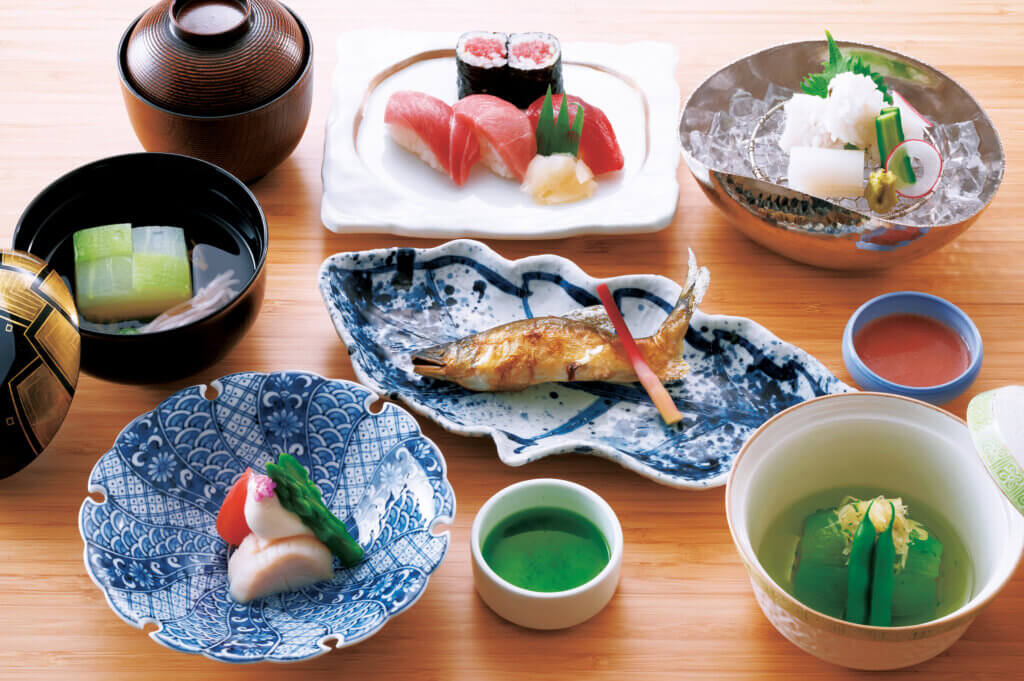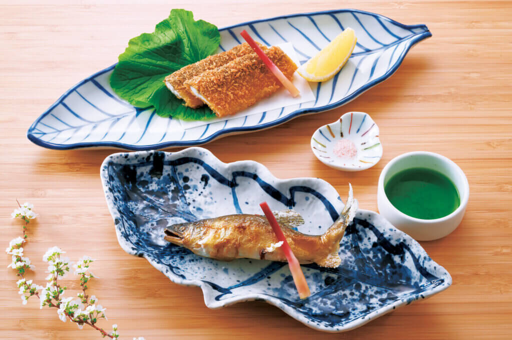 季節の食材である熊野鮎を、塩焼きまたはフライでお召しあがりいただけます。お食事には、鮪食べくらべ寿司をご用意しました。