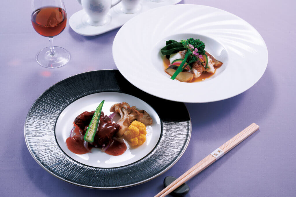 メインディッシュを 2 種からお選びいただくランチコースです。野菜を麒麟の模様に見立てた“鯛の麒麟飾り蒸し”と“やまゆりポークのスペアリブ”よりお選びいただけます。