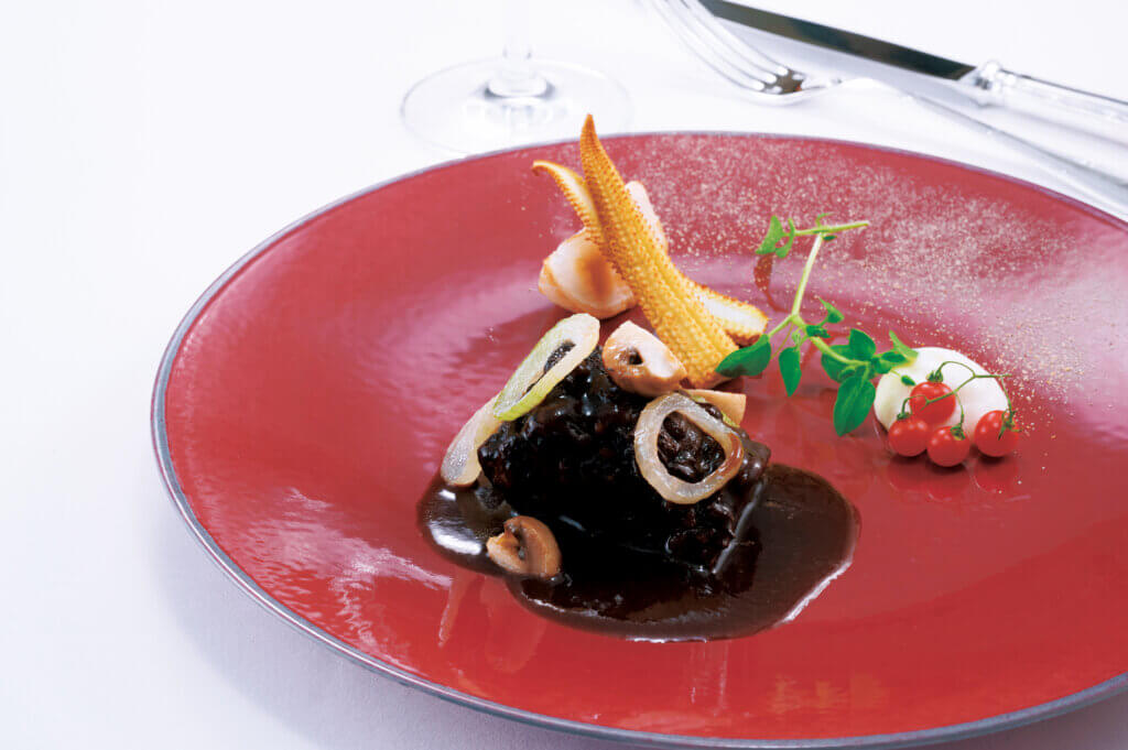 美食の街リヨンをイメージし、初夏の食材を使って郷土料理をスタイリッシュにアレンジしました。牛肉の煮込み料理“ブッフブルギニョン”は、パウダー状にしたじゃがいもの皮とじゃがいものピューレを添えて、サステナブルな一皿に。