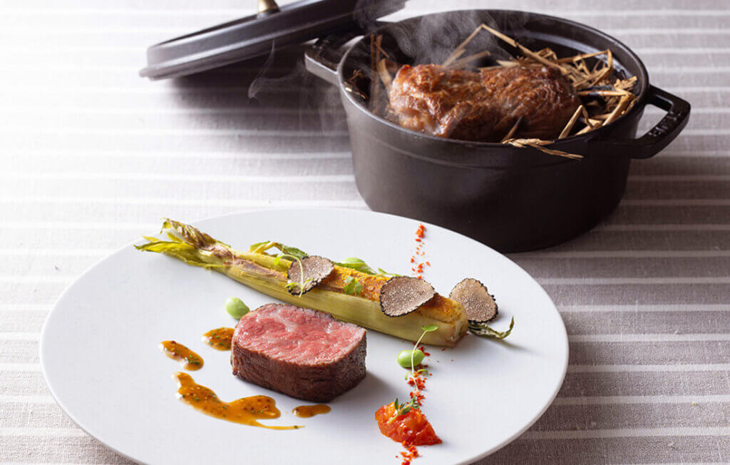 2024年7月12日(金)~8月31日(土)の期間、プリフィックスコース(※)のメインディッシュにて、追加料金でお楽しみいただける「黒毛和牛サーロインのロティ マスタードソース トリュフ風味のポレンタを詰めたヤングコーンとピペラード添え」をご用意します。