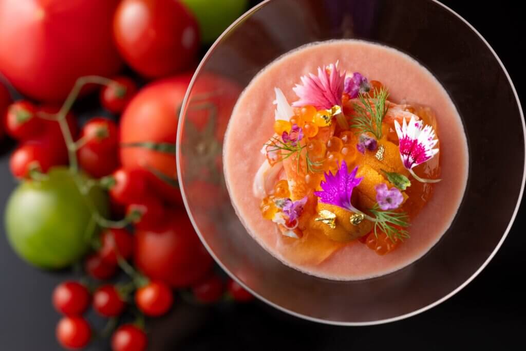 前菜で登場するのは「フルーツトマトのムースと海の幸カクテル」。涼しげなカクテルグラスの中に、フルーツトマトのムース、コンソメゼリー、ウニやカニ、フレンチキャビアを贅沢にあしらいました。さらに、エディブルフラワーや金箔を飾り、「クイーン・アリス」らしい華やかさに仕上げます。