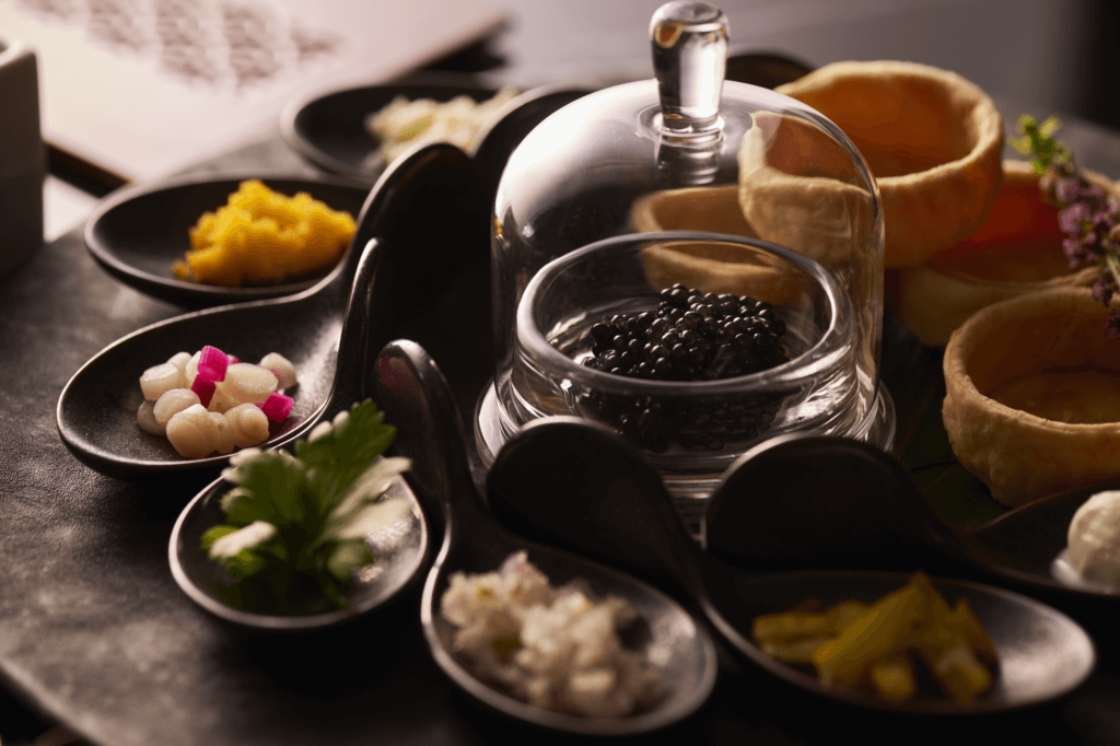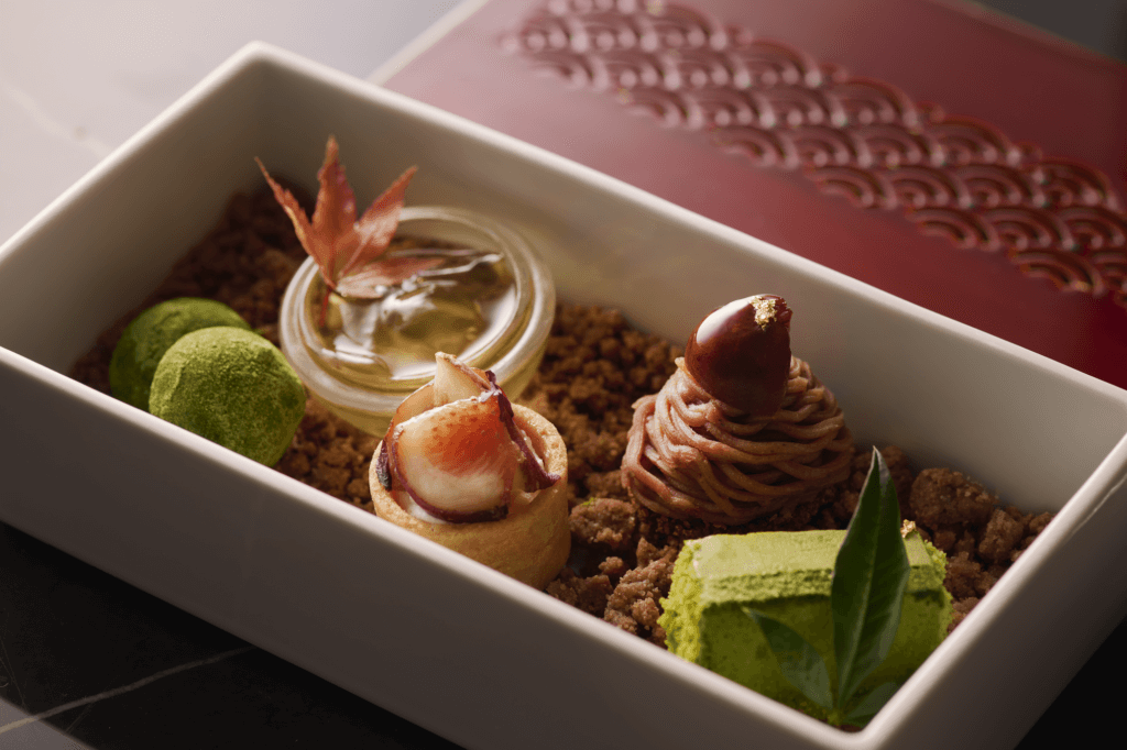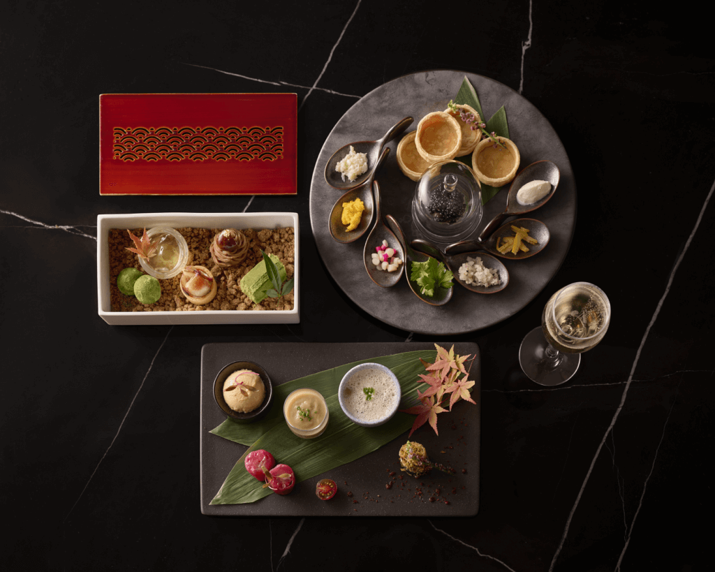 今回の 5 周年を祝し、Pier 8 のエントランスにある螺旋階段をイメージしたイタリア産キャヴィアプレ ート、和の素材を取り入れた 5 種のセイボリー、中秋から晩秋にかけての Pier 8 の中庭をイメージした5種のスイーツを用意。