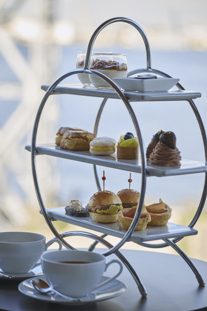 夕暮れから夜景に移りゆく海と街を傍らに、レストラン&バーで英国式「ハイティー」スタイルのプレート、セイボリー、スイーツで上質なティータイムを満喫できるプラン。