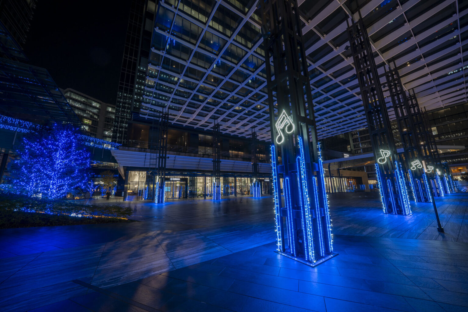 ヤマハミュージックのある横浜シンフォステージでは、柱の上に飾られた音符から光が流れ落ちる粋な演出