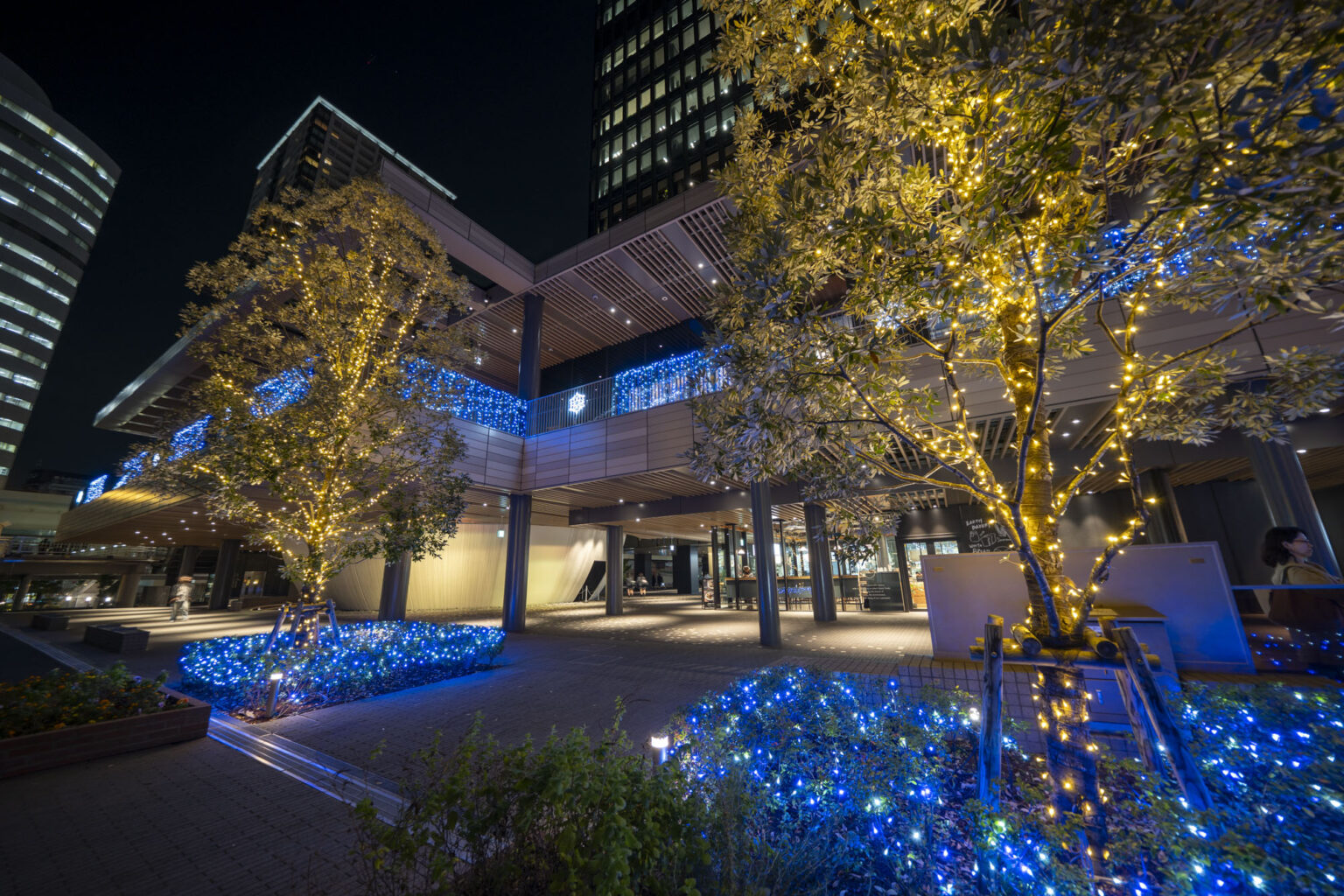 建物の横から新高島駅入口までのスペースには、青と黄色・白のイルミネーションが彩ります