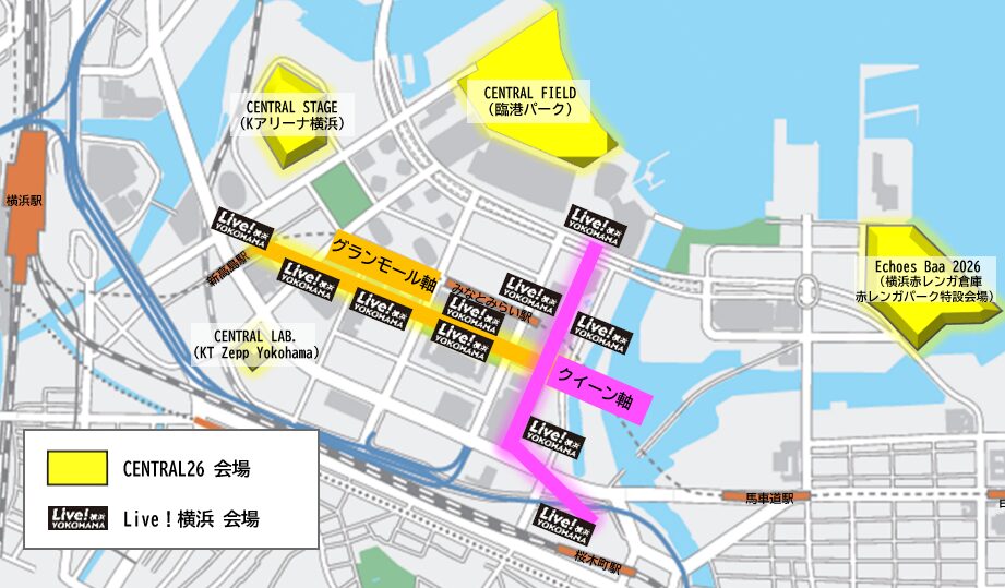 メイン会場のCENTRAL STAGE(Kアリーナ横浜)、Echoes Baa(横浜赤レンガ倉庫 赤レンガパーク特設会場)、CENTRAL LAB.(KT Zepp Yokohama)で豪華アーティストがライブを繰り広げ、
