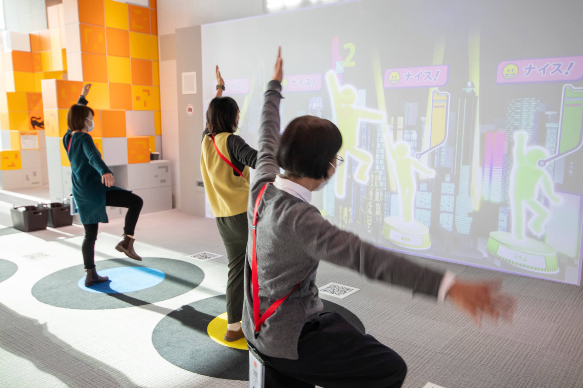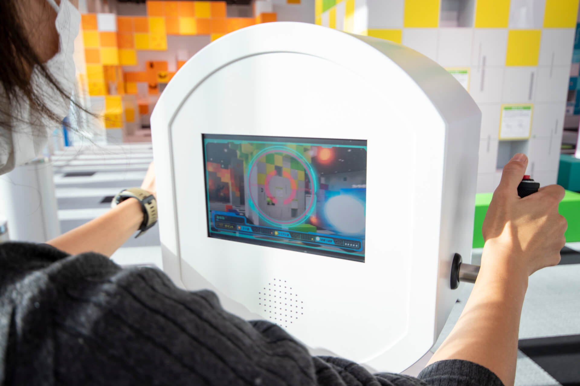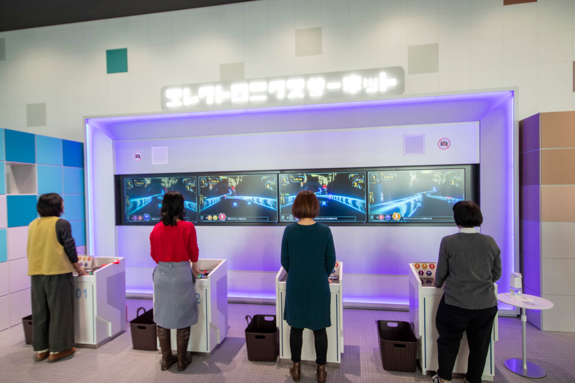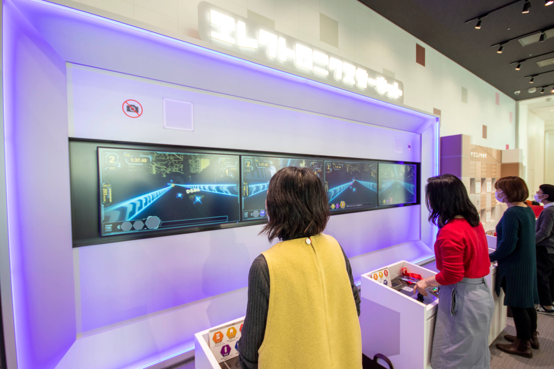 このクイズを 3 問回答するごとに、カーレースなどのゲームが体験できます。これらのゲームは、クイズの内容に紐づいていて、理科や科学技術に親しむことができます。この日訪れたスタッフ 4 人で本気のバトルに汗を流しました。
