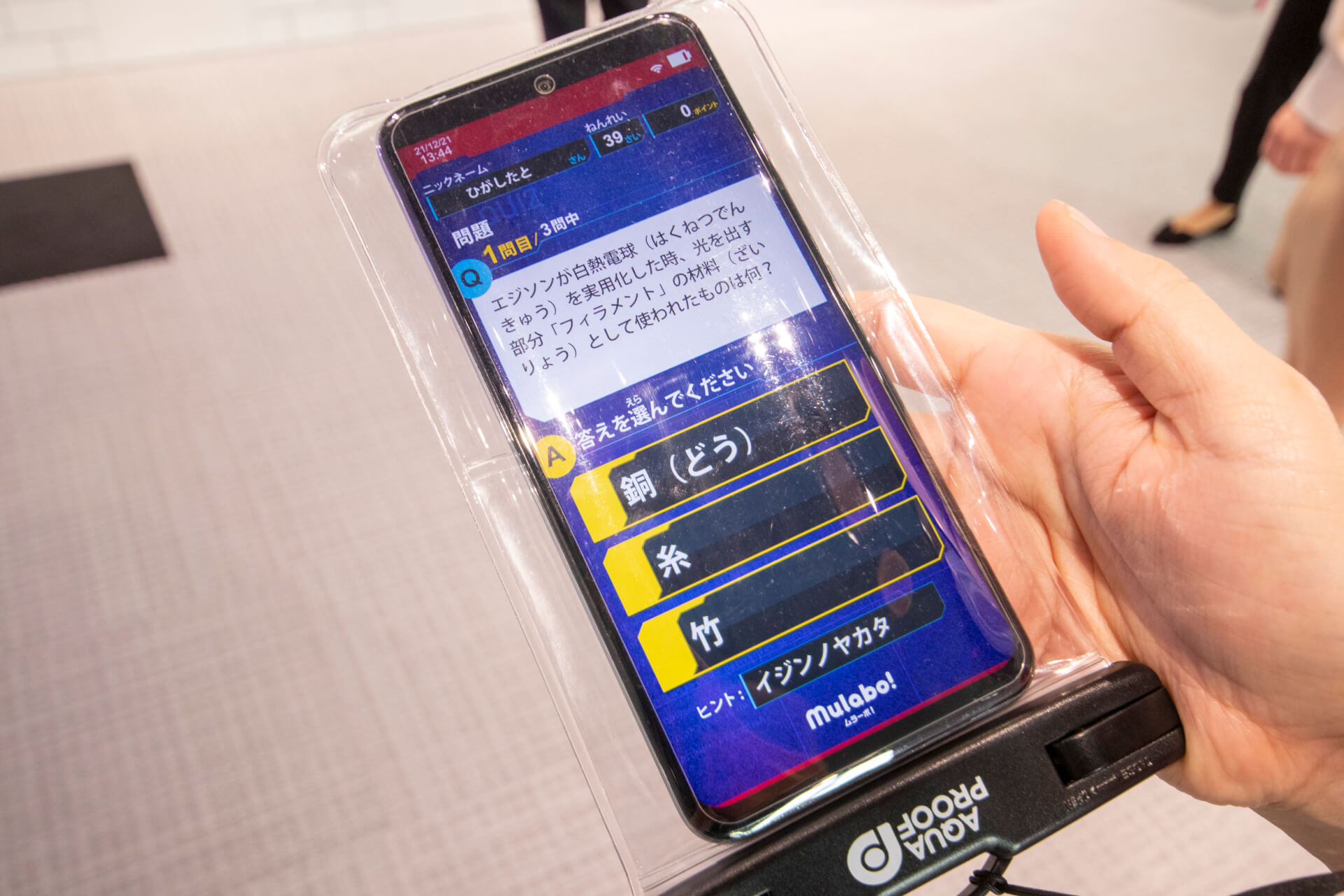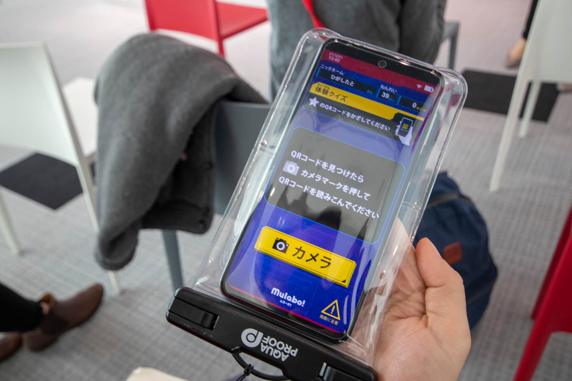 サイエンス体験展示の「ディスカバーゾーン」 に入ると、一人に一台、大きめのスマートフォンサイズの端末「ムラーボガイド」が手渡され、この端末を使ってクイズにチャレンジします。